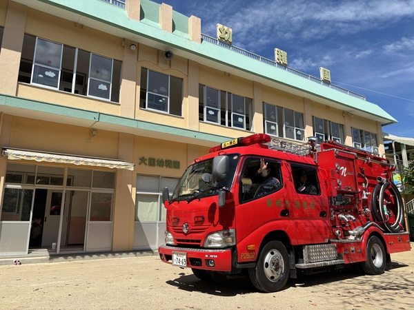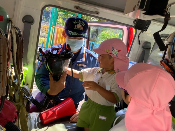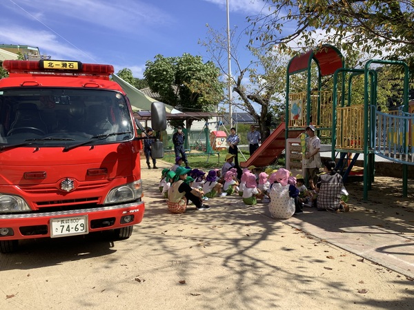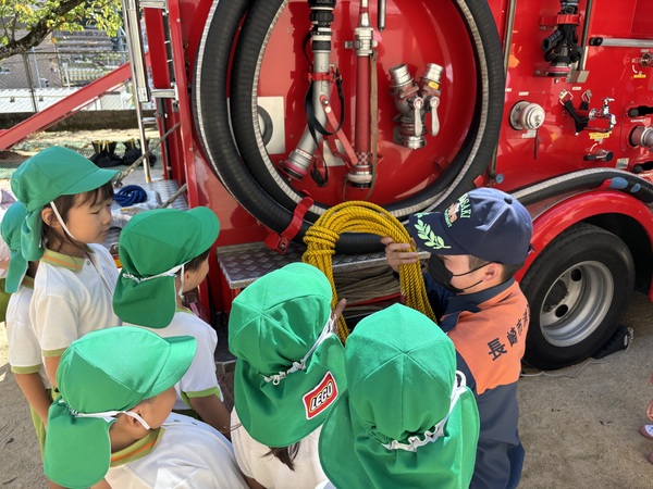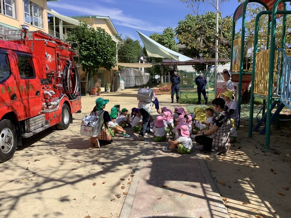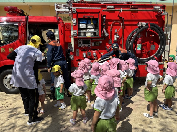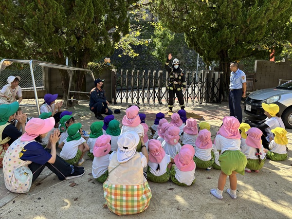 ウ〜ッ 消防車が到着しました〜! 消防士のお仕事のこと消防車のことたくさん教えていただきました消防士さんとってもかっこよかったね♡「大きくなったら消防士になりたいひと〜⁇」「はーい!」みんなの手があがりました♪ 消防車に乗ってみよう! 色んな道具があるよ これは何かな? 着替えるのも早いね! ありがとうございました♡ また来てね〜! 2025/09/20