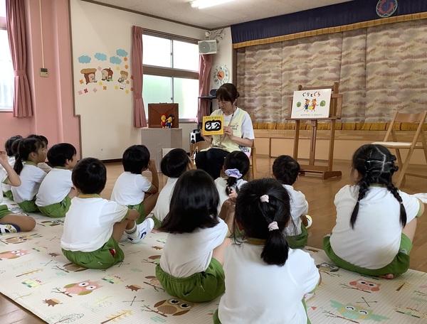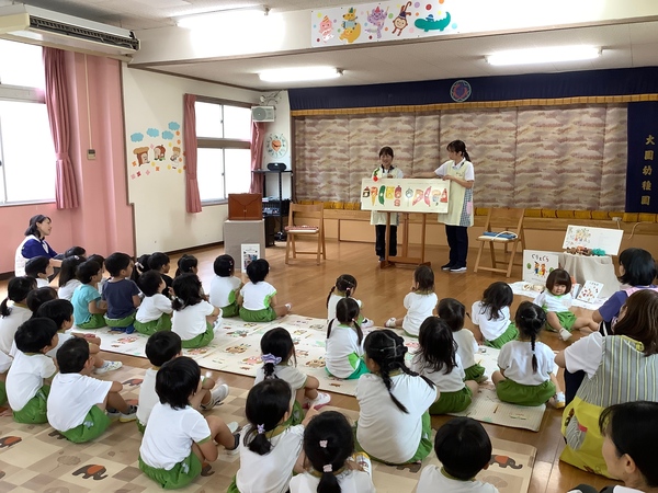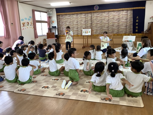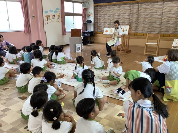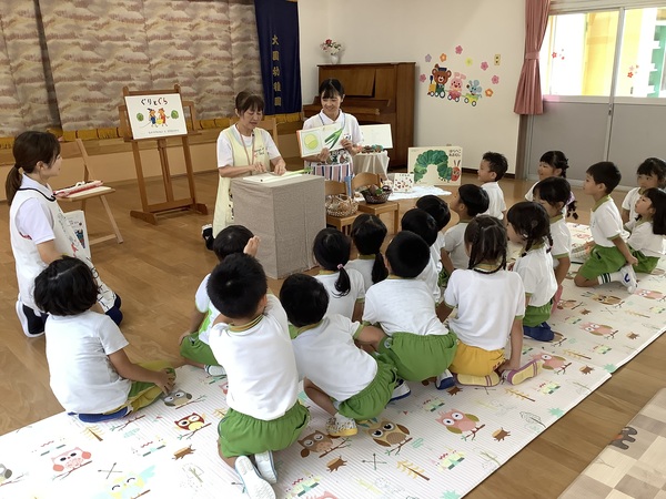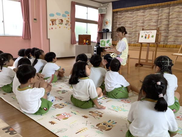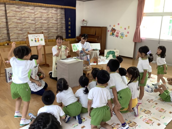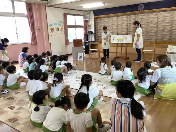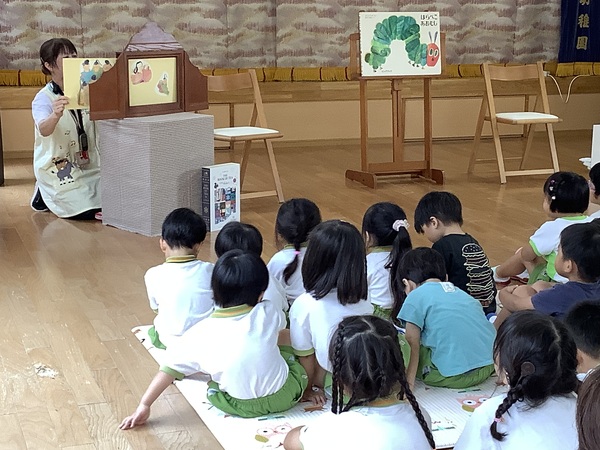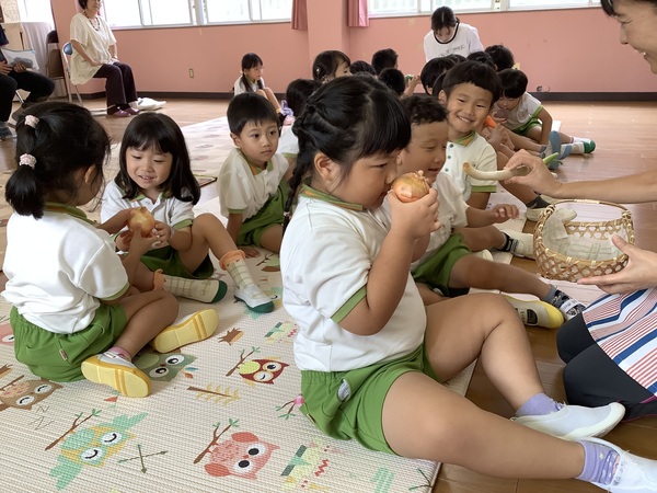 10月の絵本の日 第2部 年中組と年長組さんだけ参加して第2部のはじまりはじまり〜「やさいのおなか」やさいのおなかってどうなってるの?それではチョキンっと切ってみましょう!わ〜 すごいね〜絵本といっしょおもしろいね〜 やさいのおなか ??? ピーマンって‥‥ どんな匂いかなぁ? ネギを切ってみますよ♪ 絵本といっしょだね 2025/10/15