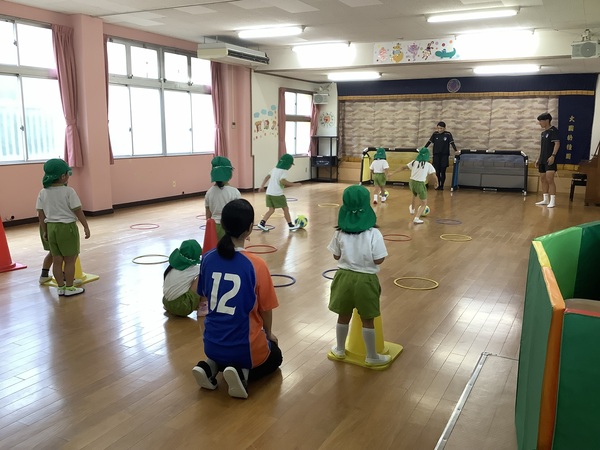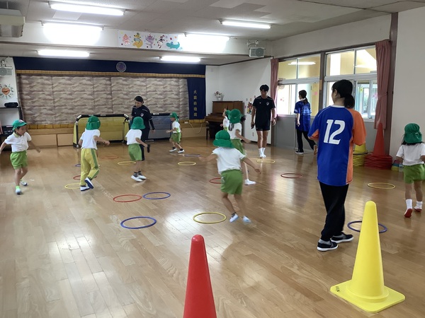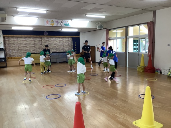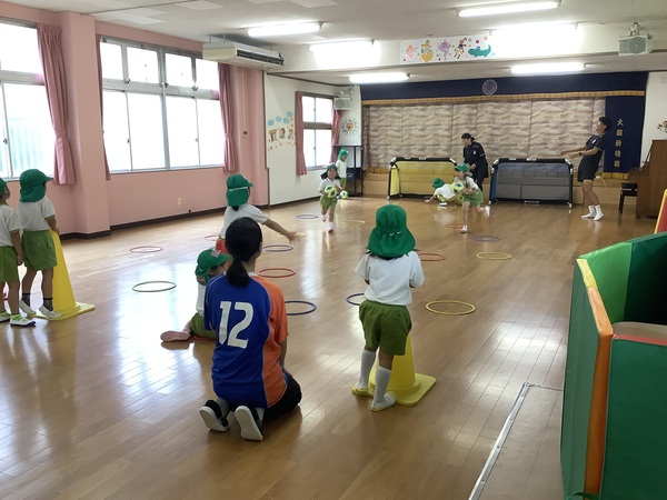 VVVタイム☆彡 雨〜!ということで‥‥室内でのVタイムとなりました運動会を経験しての年長さんひと回りもふた回りもたくましくなってVタイムも元気に楽しみました♪ 走って〜 ピピッ きいろ! ボールをけって ゴール! 次の人にバトンタッチ! 2025/10/16