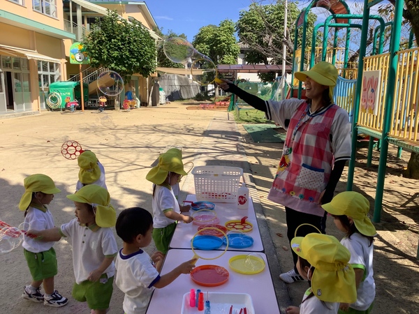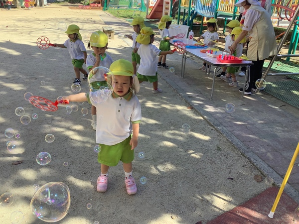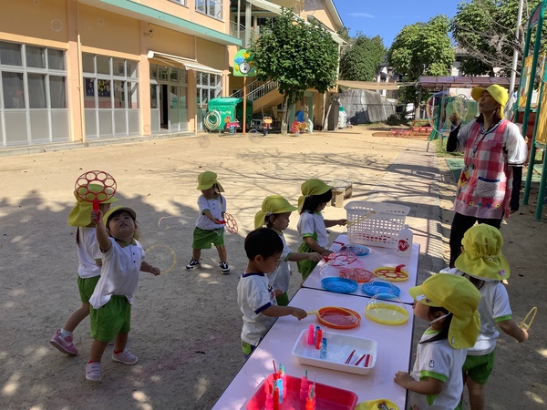 シャボン玉 とんでけ〜♪ 澄み渡る秋空のもとシャボン玉遊びを楽しみました〜♪ふ〜っ 息を吹いてすご〜い たくさんできたよ〜もっともっとできるかなぁ ふ〜っ♪ シャボン玉 いっぱい! 遠くまでーー とんでけ〜♪ 2025/10/21