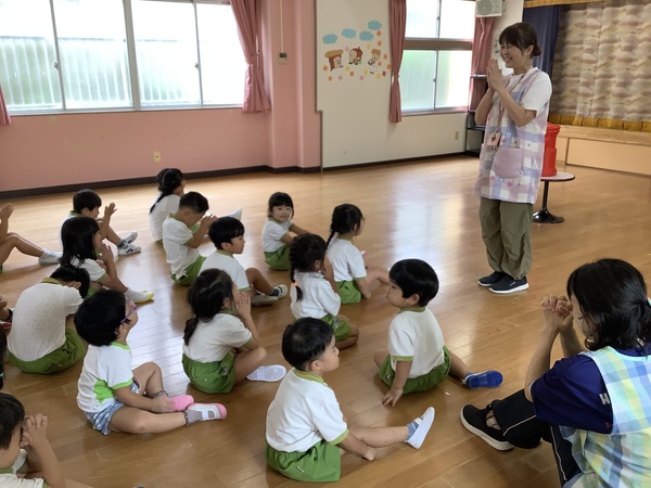 運動会の練習の後は‥‥ 今日は運動会の開会式の練習ですお外はとっても暑いので熱中症に気をつけながら時短で行いました♪そして たくさん汗をかいた後は‥‥思いっきりクールダウンお部屋を暗〜くして妖怪の絵本を読んで身も心も ひんやりとした年長組さんでした〜!とっても楽しかったね♪ 開会式の練習♪ その後は‥‥?? 2025/09/05