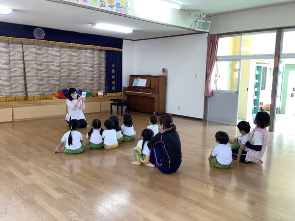 みわ先生のわくわくリトミック〜♪ みわ先生のわくわくリトミック〜♪ 今日は、大きなシフォン布を 秋の歌に合わせて 上げたり下げたり… 右へ左へ… ゆっくりやさしく ゆら〜ゆら〜♪ 今度は、床へごろん♪ シフォンの中から見る景色って なんだかおもしろーい‼︎ シフォンの上のもみじが踊ってる♪ ボールをおとなりさんへ… おもしろーい‼︎ ふわり パラバルーンみたい‼︎ ゆーらん ゆーらん🎵 楽しいね〜 2023/10/23